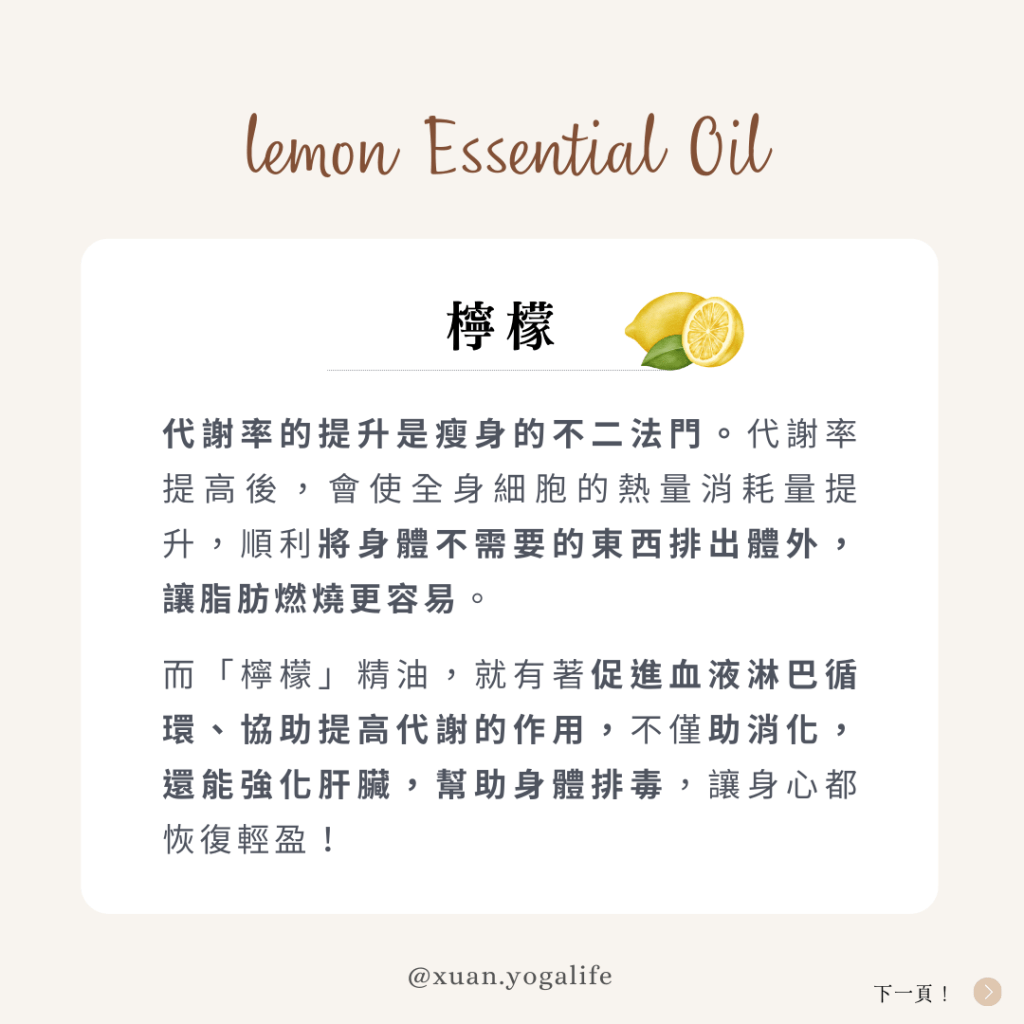 代謝率的提升是瘦身的不二法門。代謝率提高後會使全身細胞的熱量消耗量提升,順利將身體不需要的東西排出體外,讓脂肪燃燒更容易。而「檸檬」精油,就有著促進血液淋巴循環、協助提高代謝的作用,不僅助消化,還能強化肝臟,幫助身體排毒,讓身心都恢復輕盈!