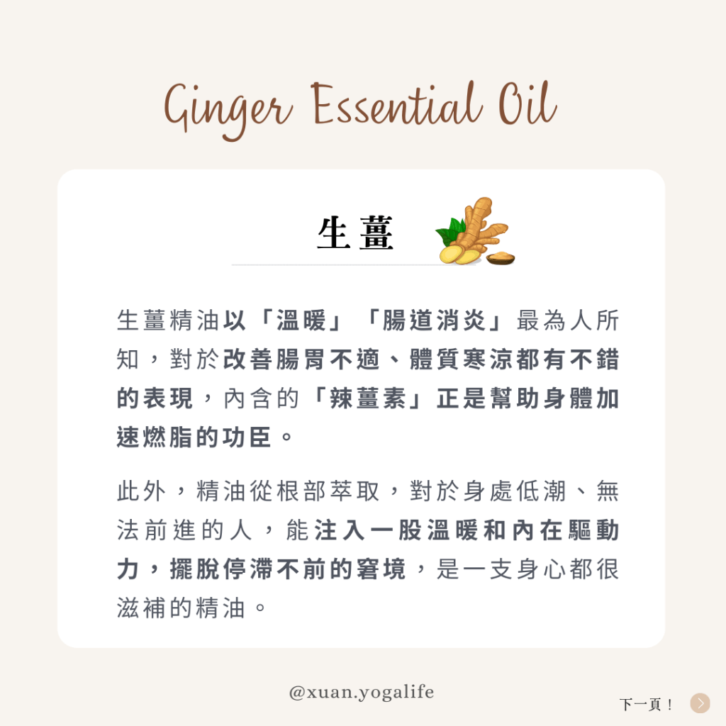 生薑精油以「溫暖」「腸道消炎」最為人所知,改善腸胃不適、體質寒涼都有不錯的表現,內含的「辣薑素」正是幫助身體加速燃脂的功臣。此外,精油從根部萃取,對於身處低潮、無法前進的人,能注入一股溫暖和內在驅動力,擺脫停滯不前的窘境,是一支身心都很滋補的精油。