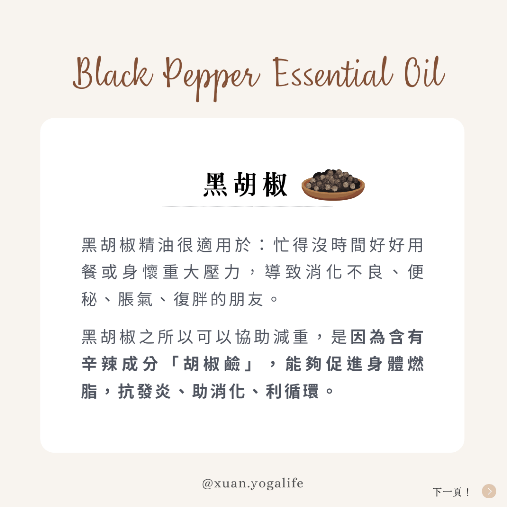 黑胡椒精油很適用於:忙得沒時間好好用餐或身懷重大壓力,導致消化不良、便秘、脹氣、復胖的朋友。之所以可以協助減重,是因為含有辛辣成分「胡椒鹼」,能夠促進身體燃脂,抗發炎、助消化、利循環。